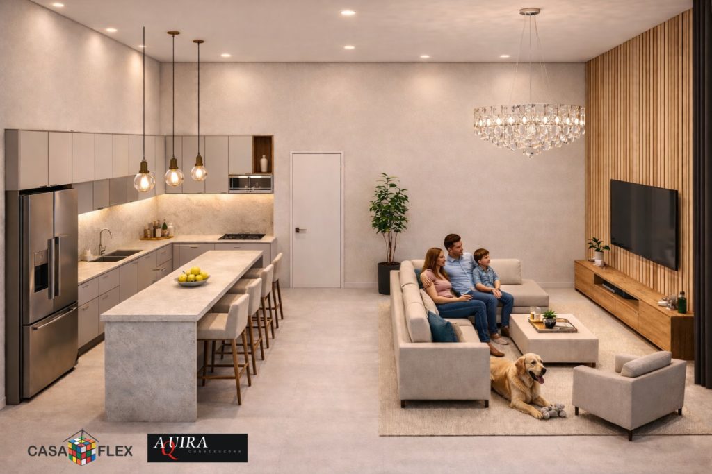 O destaque fica por conta deste estar e jantar integrados com um pé direito que chamamos de “estendido” com altura de 4,50 metros, sofisticação em uma casa compacta, funcional e TÉRREA.
